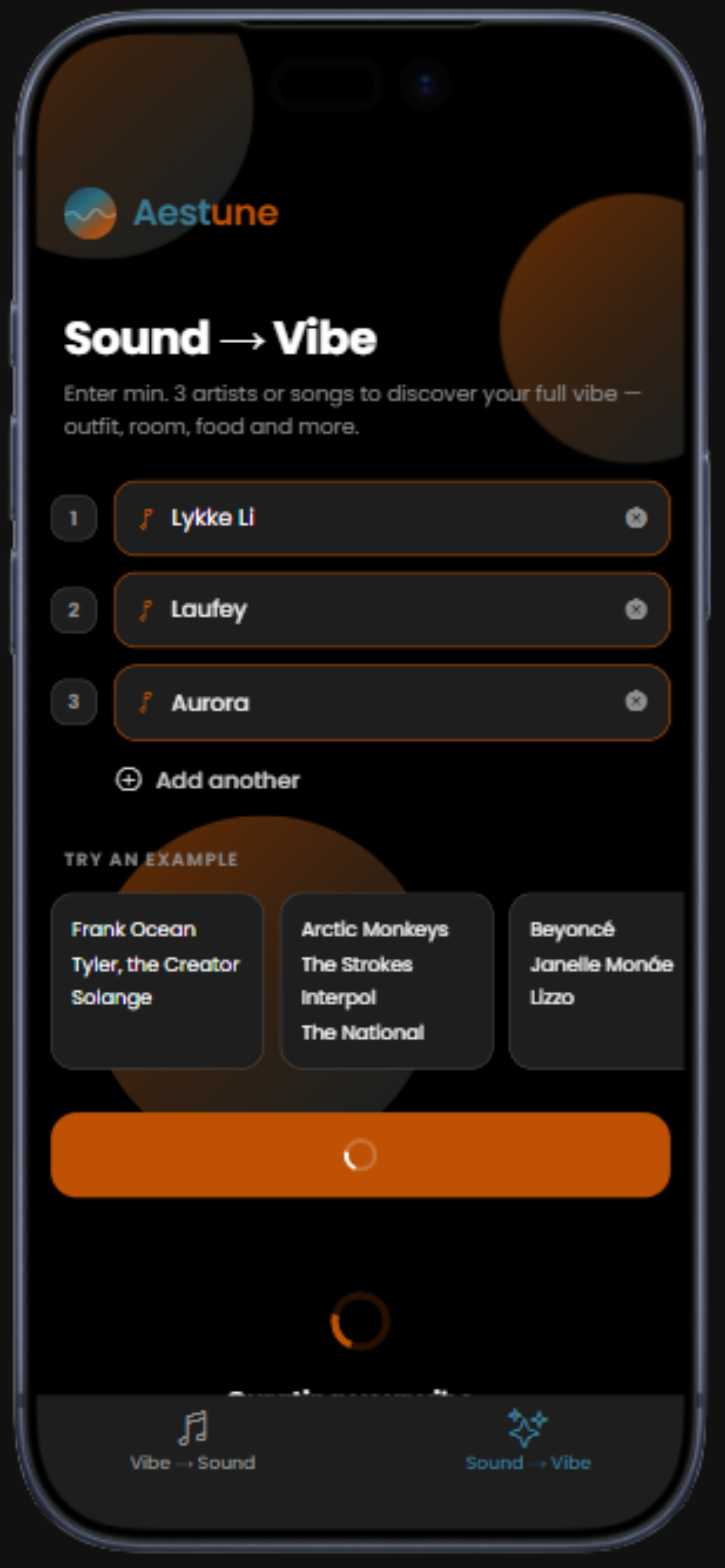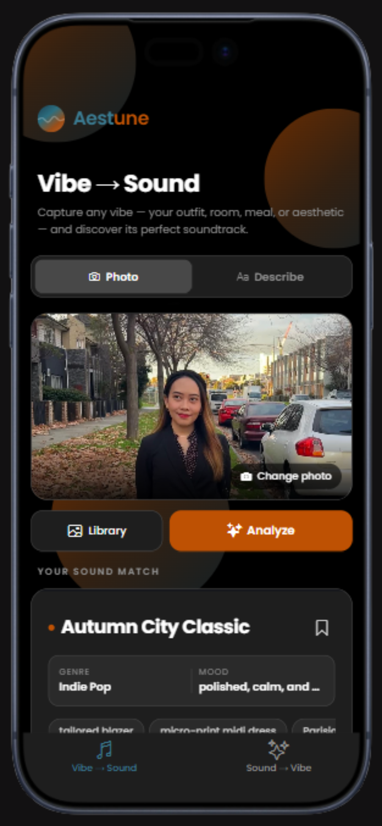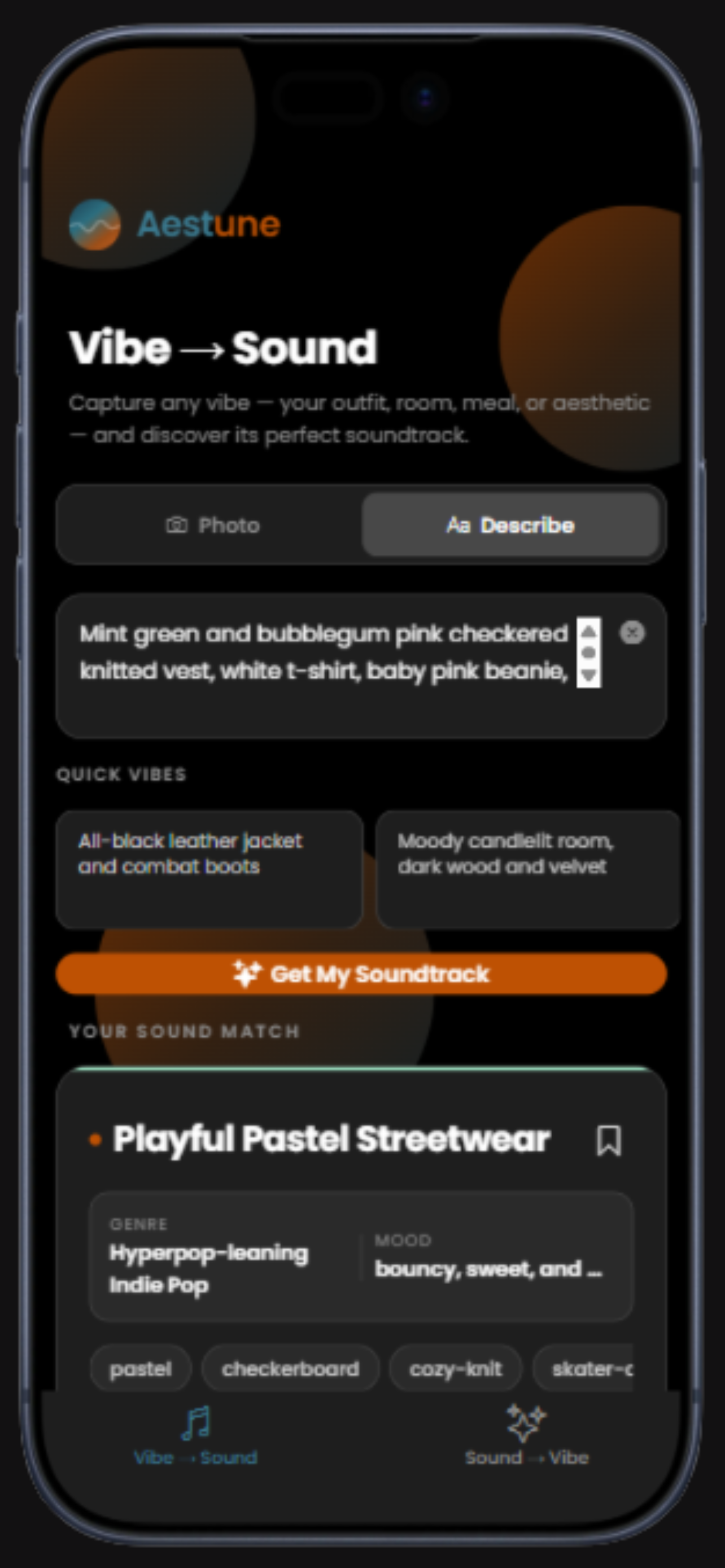 Upload or describe an outfit, room, or feeling — Aestune turns it into a curated soundtrack.