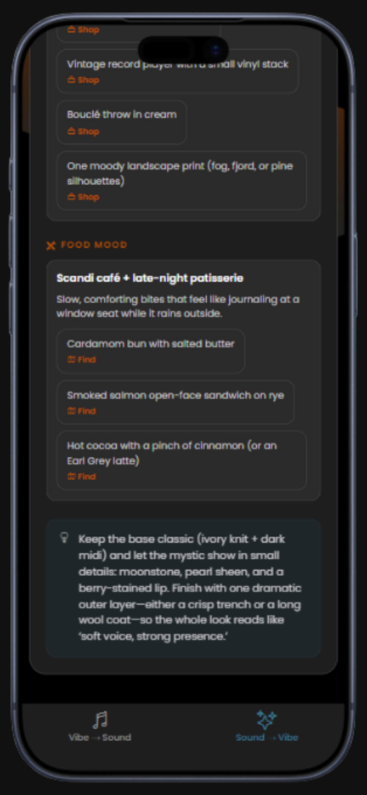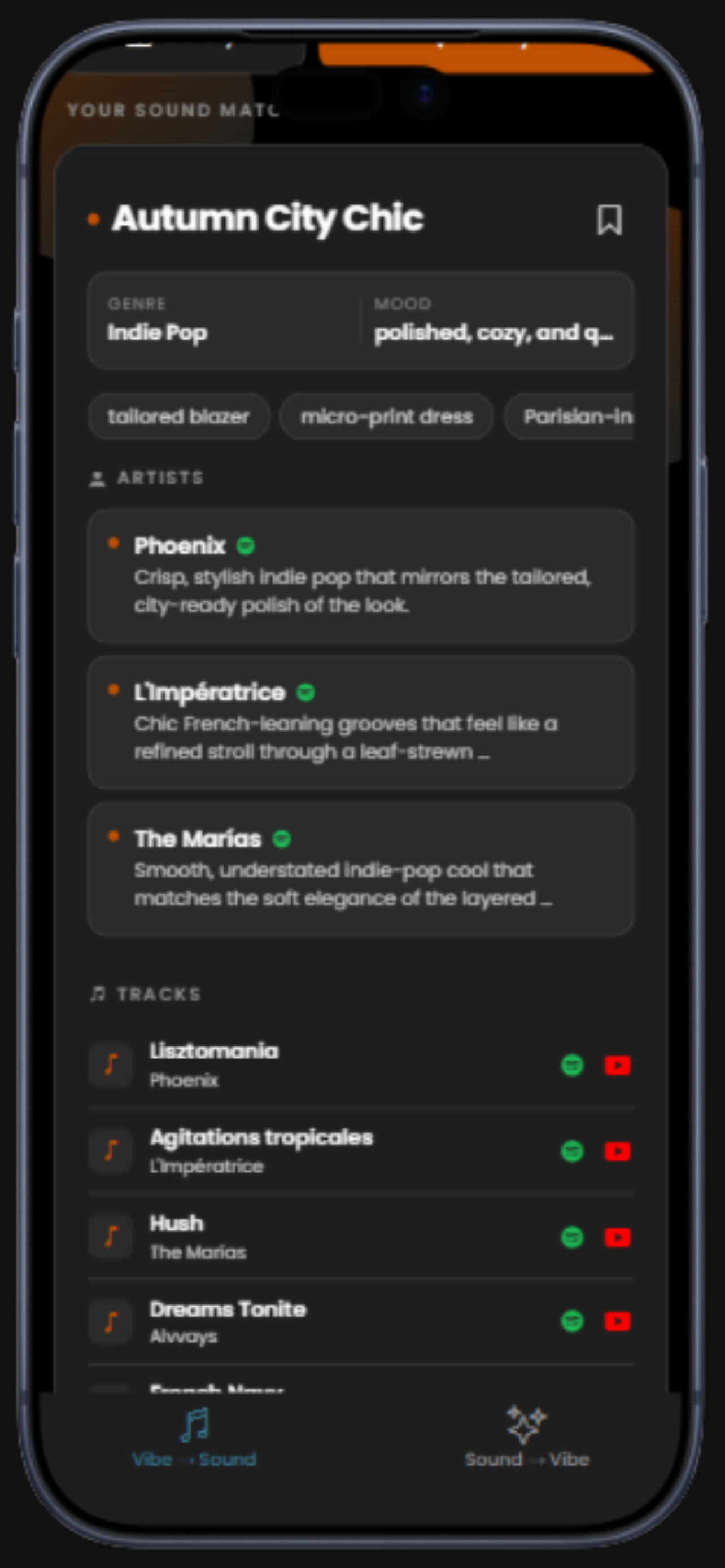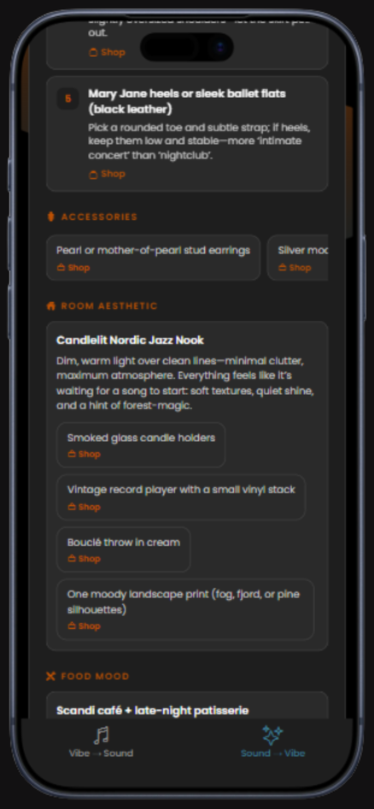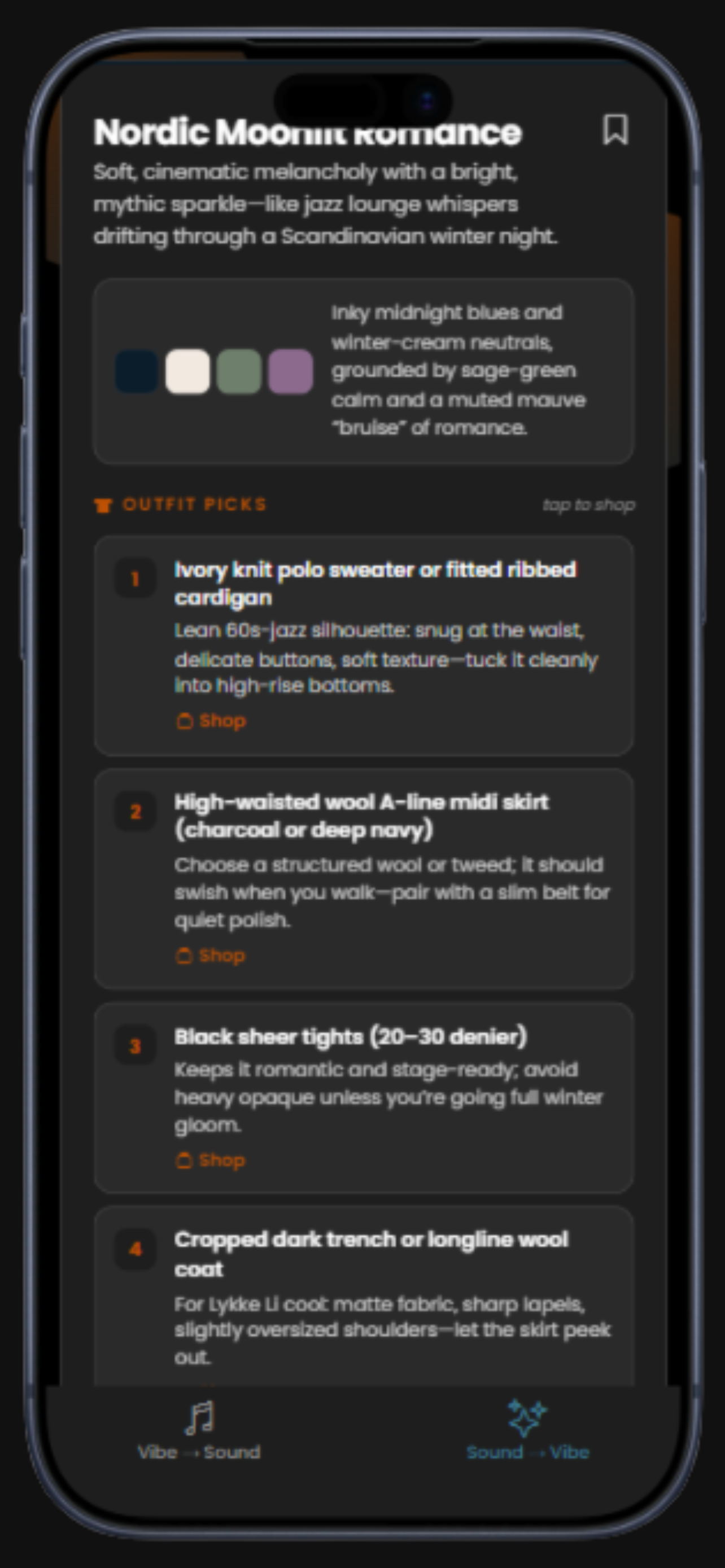 Upload or describe an outfit, room, or feeling — Aestune turns it into a curated soundtrack.